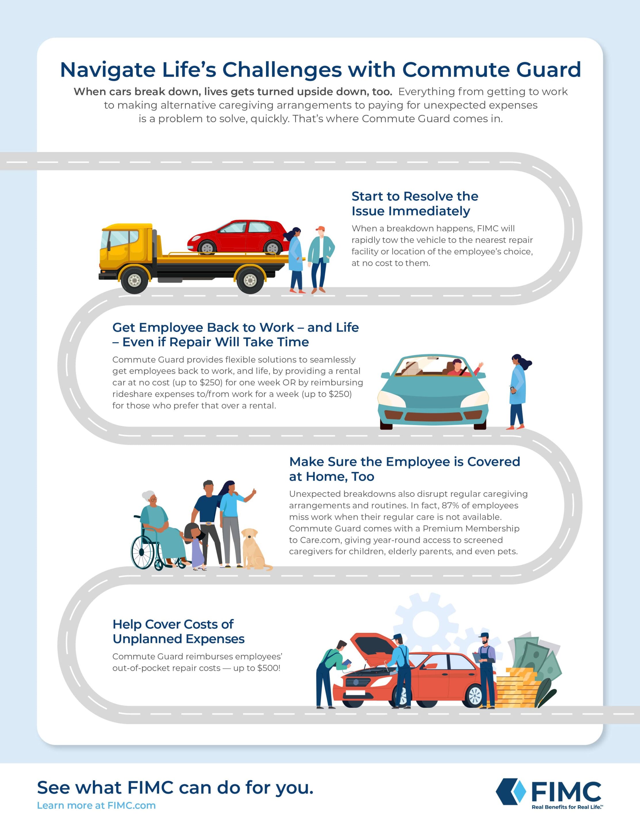 Commute Guard from FIMC helps employees and their families resolve unexpected car troubles and supports employees’ unexpected needs along the way.